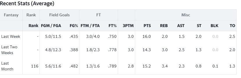 Playing about 17 minutes per game in the first 4, and 26 per game in the most recent 2 joining the starting lineup, the numbers aren’t jumping out at you right away. However, his arrow should be firmly pointed up. For those unfamiliar, Hendricks is more of a 3&D big man type like Jerami Grant or a smaller Jaren Jackson Jr. There’s some legitimate 1/1/1 on 3s STLs BLKs potential hre down the stretch. It remains to be seen if his FG% can stay close to his 45% that he shot in the G League this year, but it’s very possible he stays down closer to 40 to finish out the year. He is still also behind Lauri and John Collins in terms of touches, but an injury to either could open up way more usage for him, and he’s got the potential for some big stat lines down the stretch. In deeper leagues he should have been scooped already, but judging by his rostered % of only 6 on Yahoo, he’s still widely available. If it looks like you’ve secured a playoff spot in 12 teamers, he’s somebody I would strongly consider grabbing. Anything deeper and he’s a must own.