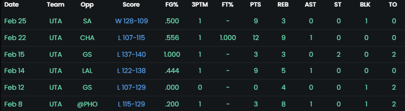 After a few moves for Utah at the deadline, they’ve managed to open up minutes for top draft choice Taylor Hendricks. Here is what his first 6 games after entering the rotation have looked like: